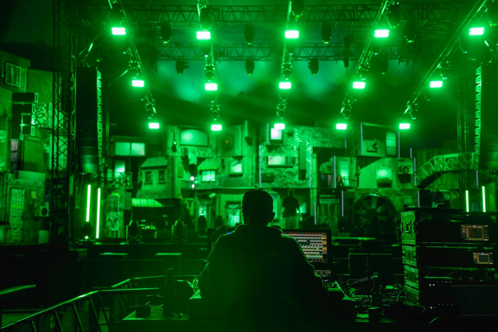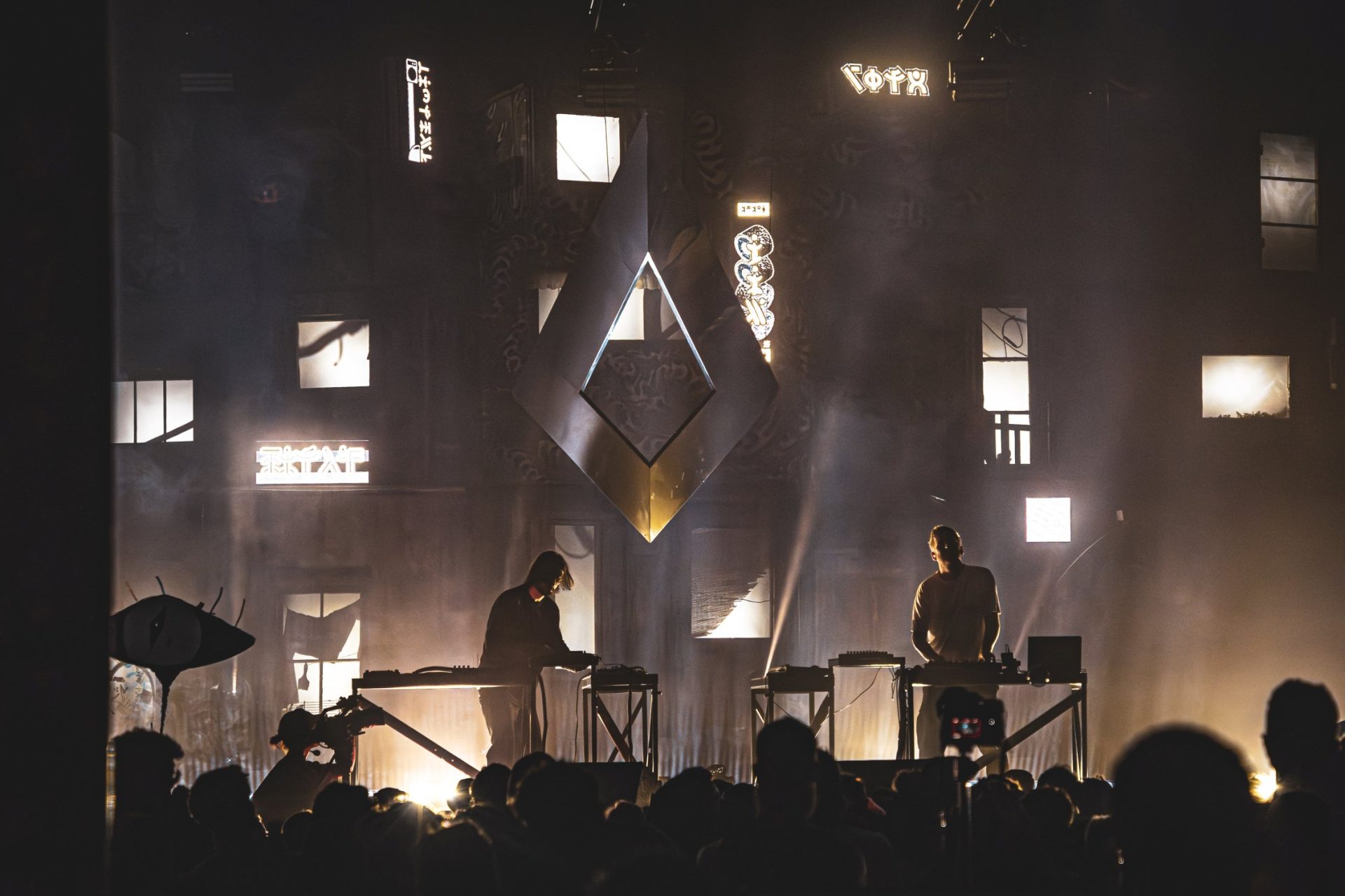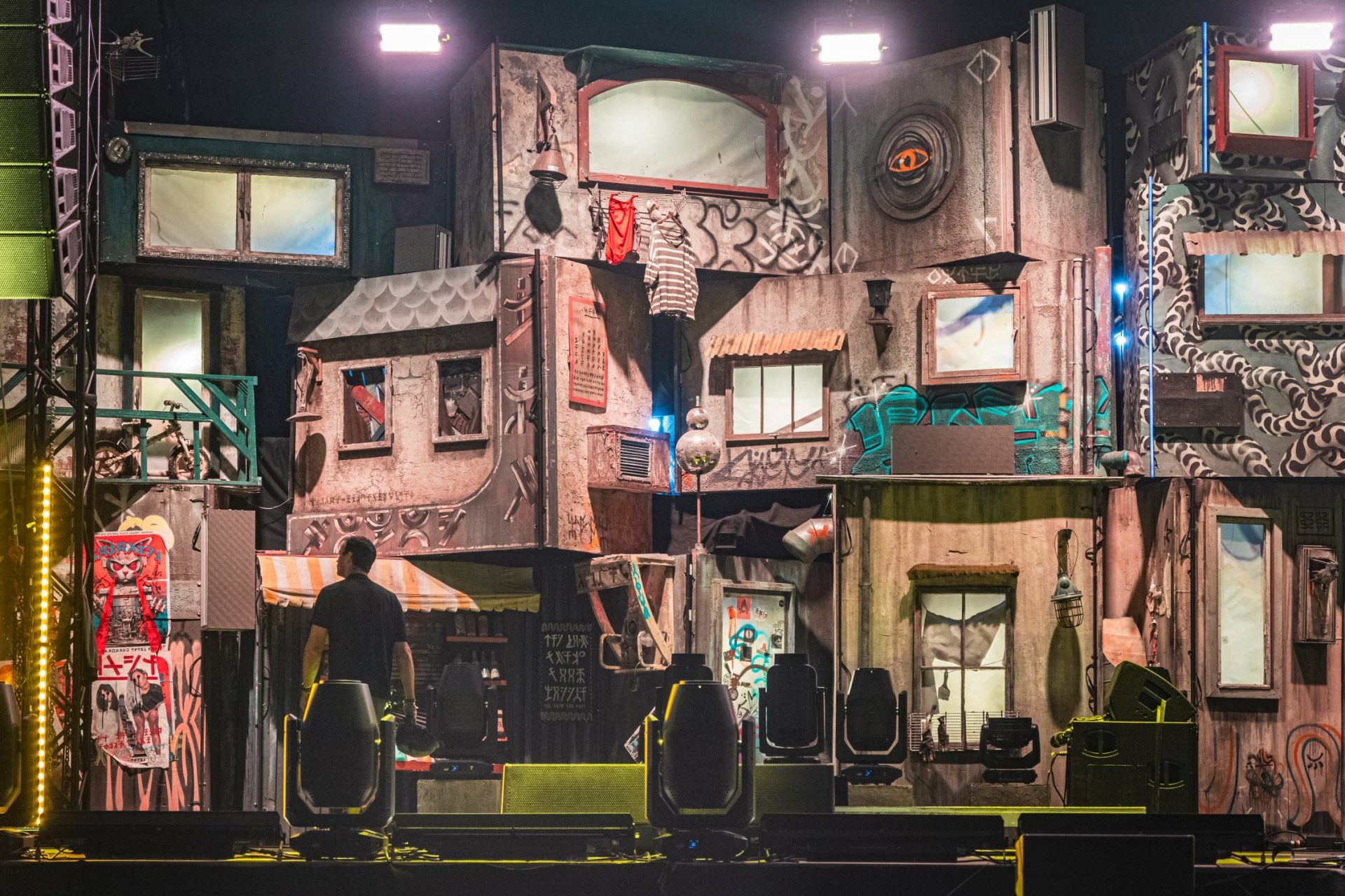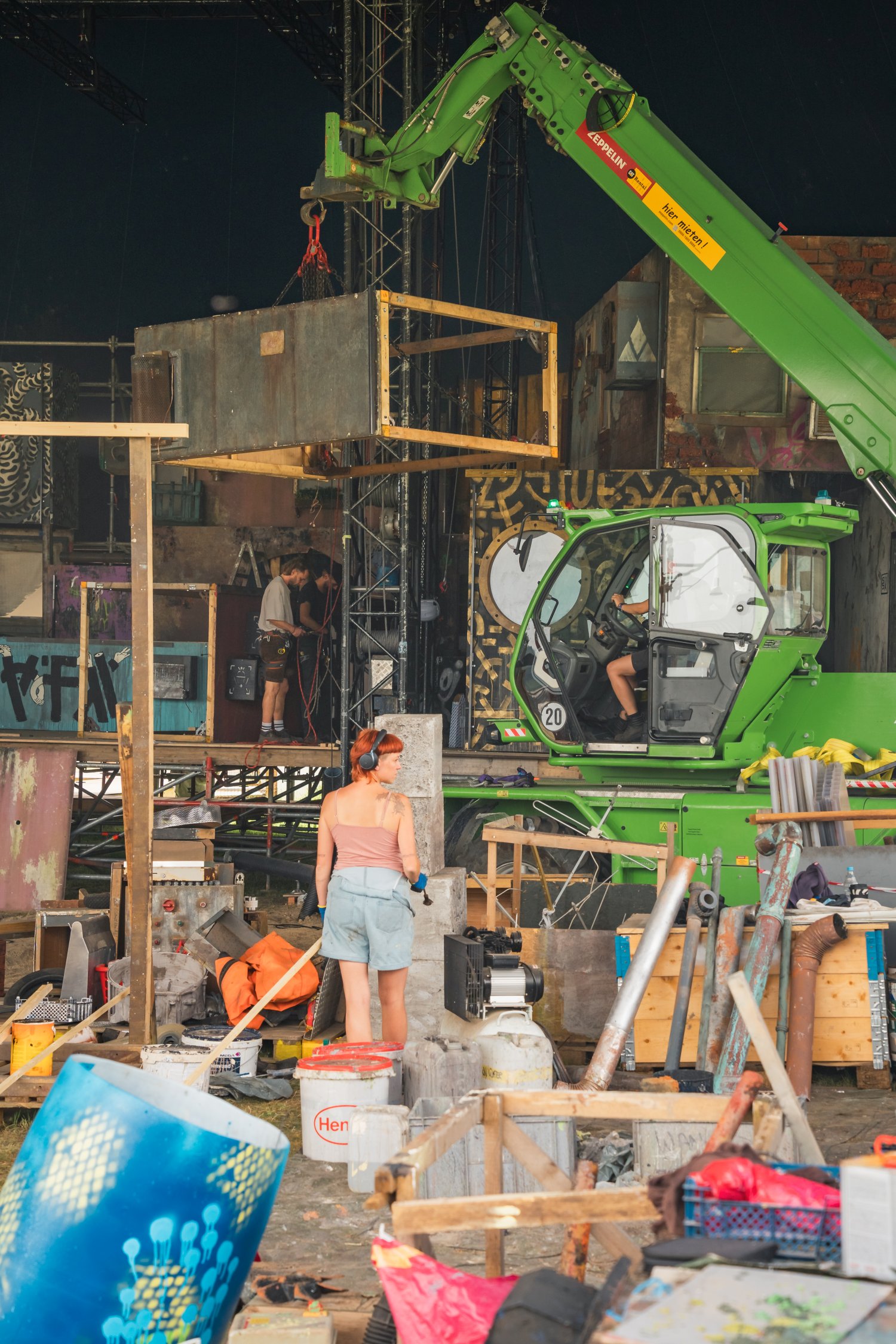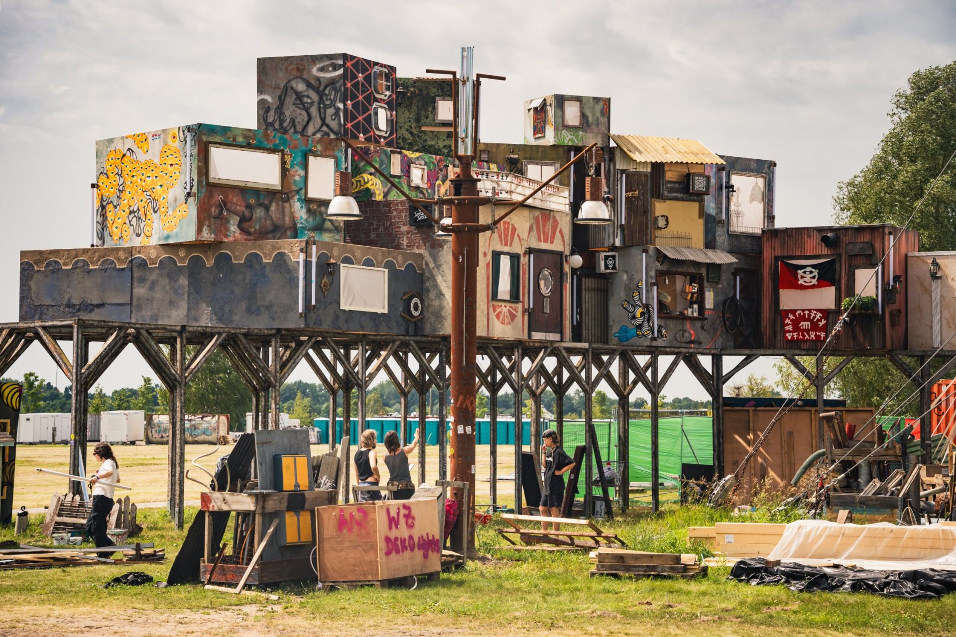 My camera accompanied the transformation of a quiet meadow into a pulsating urban cosmos. Over several weekends, I made pilgrimages to the festival grounds, watched steel and wood grow into buildings, observed how bare facades blossomed under creative hands. The Palapa area emerged as a dense labyrinth of possibilities – an architectural thought experiment, nourished by the chaotic urban canyons of Kowloon, the neon lights of Tokyo, and the dystopian dreams of Blade Runner.